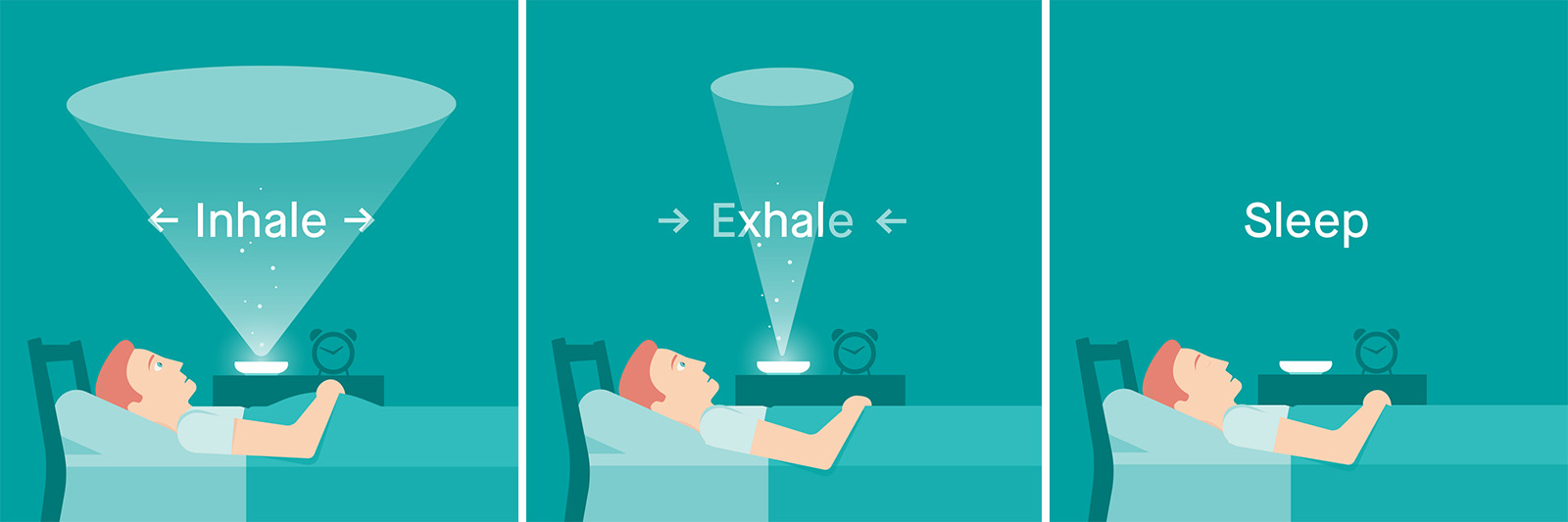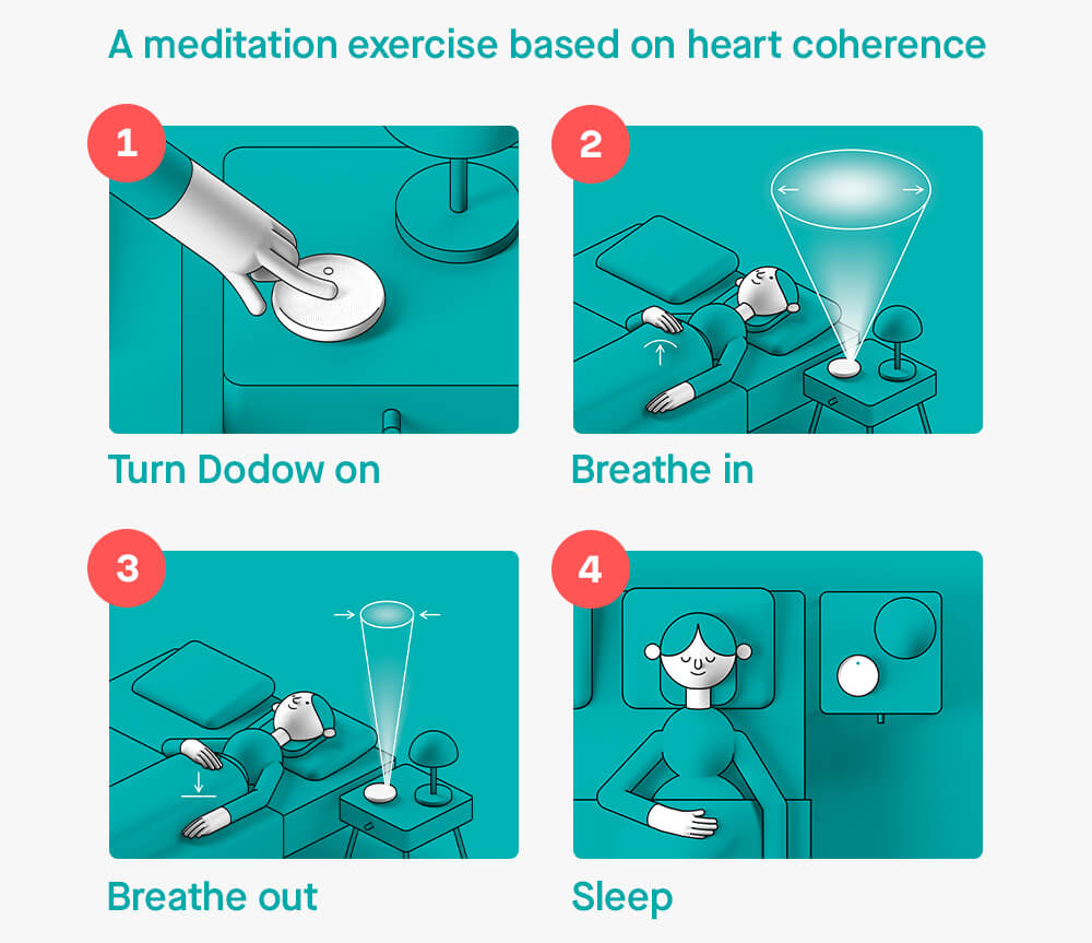 Dodow works by emitting a gentle blue light-metronome onto the ceiling. You then sync your breathing with the light as it slowly brightens and dims.