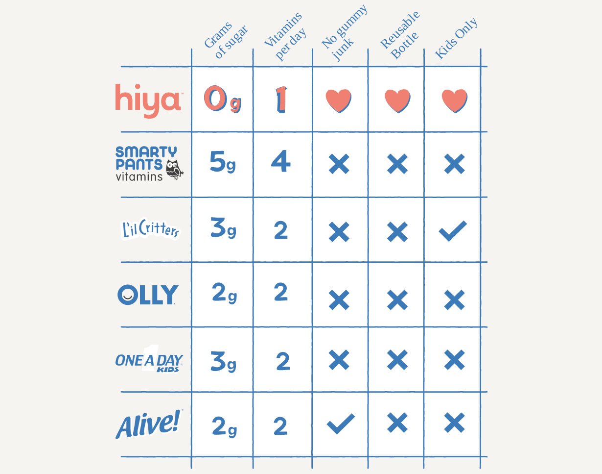 Of course, what’s NOT in these vitamins matters just as much as what is. In this case, they didn’t only cut the sugar… Hiya is also completely free from artificial preservatives, dyes, and gummy fillers. It delivers what our kids need – and nothing extra! Check out the label: