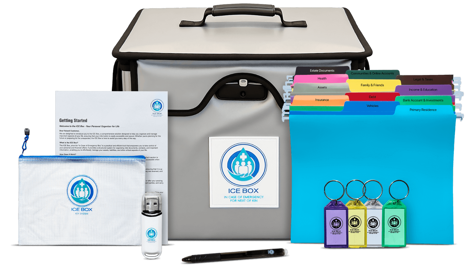 - A Legacy Organizer – ICE Box ensures your final wishes, documents, passwords, and treasured items are all secured and clearly documented.
