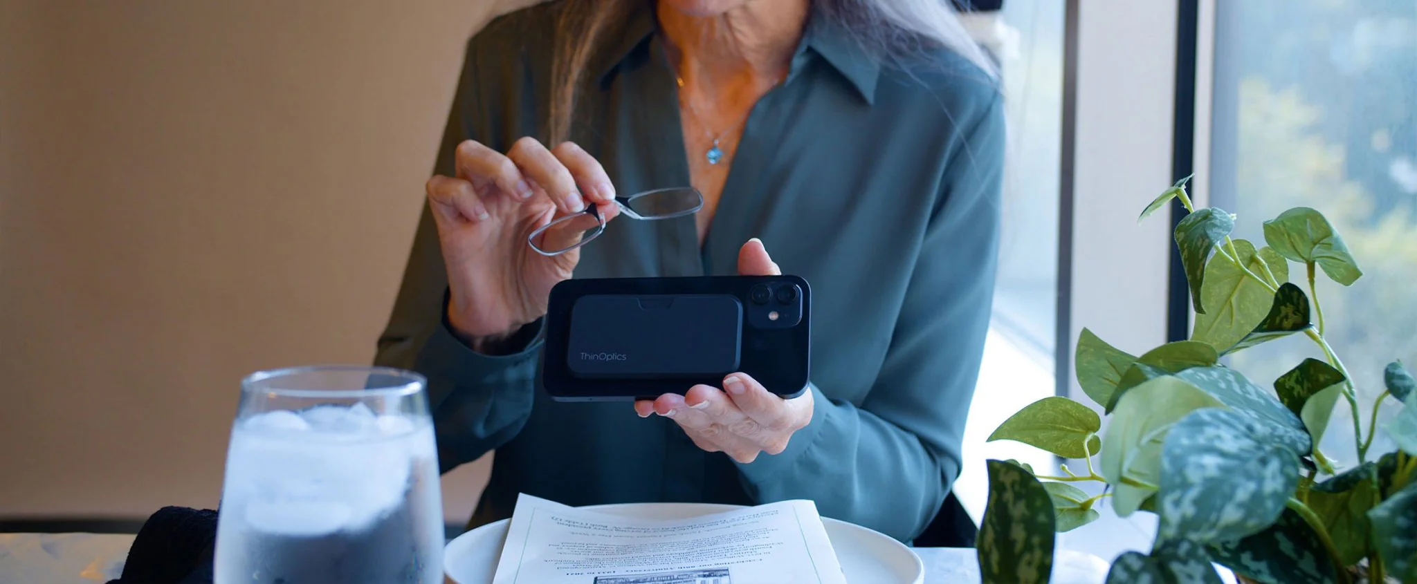 “I love, love, LOVE my ThinOPTICS reading glasses!! I can’t tell you how much time I’ve saved looking for where I left my glasses. (Why do they all gather in one spot and never where I remembered putting them?) Now I know exactly where they are – on the back of my iPhone which I almost always have with me, or at least know exactly where it is. Reading text messages and emails on my phone, prices and labels at the store, signing receipts….the list goes on. All those times when I need Readers on for just a few seconds, my ThinOPTICS are right there SO readily available – easy to pop on, quick to put away. And amazingly, they STAY on better than my regular reading glasses. Even if I bend over to pick something up, they stay firmly and comfortably in place.” – Carolyn